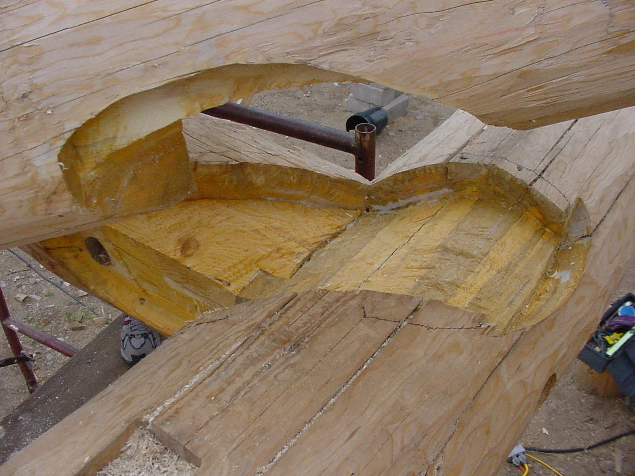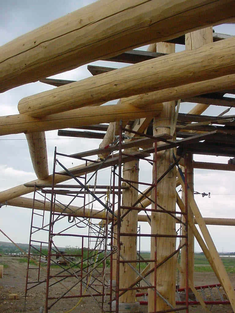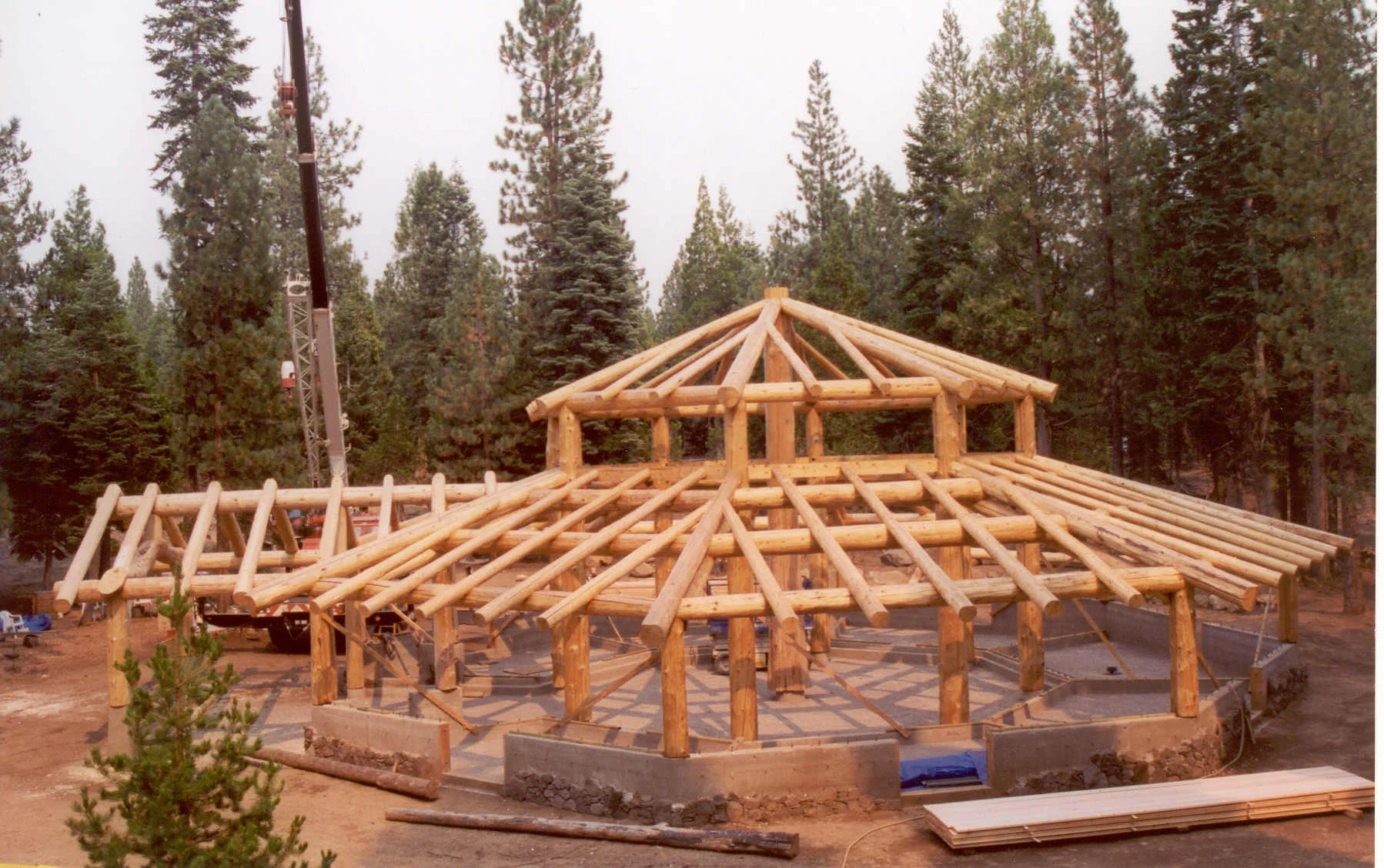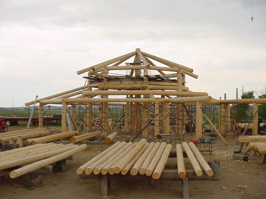 A barn in the round, built of blown-down spruce logs (salvaged near Steamboat Springs, Colorado) for an off-the-grid High Sierras horse ranch.